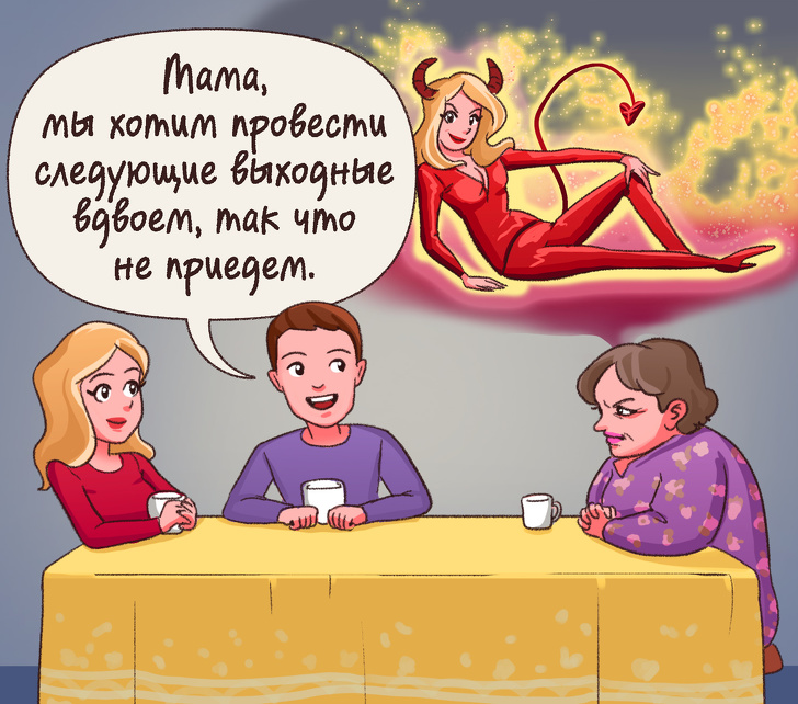 Однак жінка має повне право сказати їй: «Я люблю тебе, але не хочу проводити вихідні з твоєю сім'єю». Але не варто перешкоджати його бажанням побачити маму чи батька: він може з'їздити до них один або з дітьми.