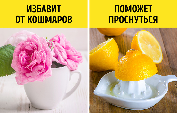 Класичним ароматом, який допоможе заснути, вважається запах чайної троянди, але, звичайно, він не повинен бути занадто нав'язливим. Допомагають бачити приємні сни також аромати ванілі, м'яти, а ось жасмин може спровокувати безсоння. Лимон — кращий будильник: він допомагає швидко прокинутися і почувати себе бадьорим, а з грейпфрутом варто бути обережним: він викликає занепокоєння.
