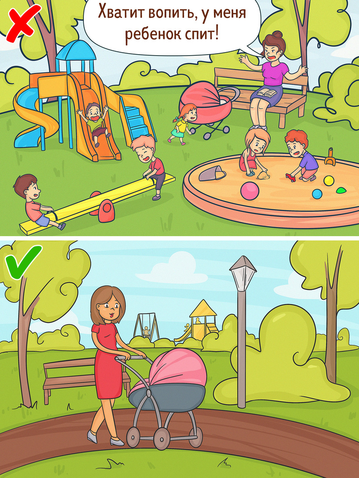 Якщо ви незадоволені тим, що діти бігають, кричать і галасують, і при цьому знаходитесь в місці, де це допустимо: на дитячому майданчику або в парку, ніяких зауважень ні батькам, ні дітям робити не має права. Краще відійти туди, де тихіше, або намагатися не відвідувати місця, які вас дратують.