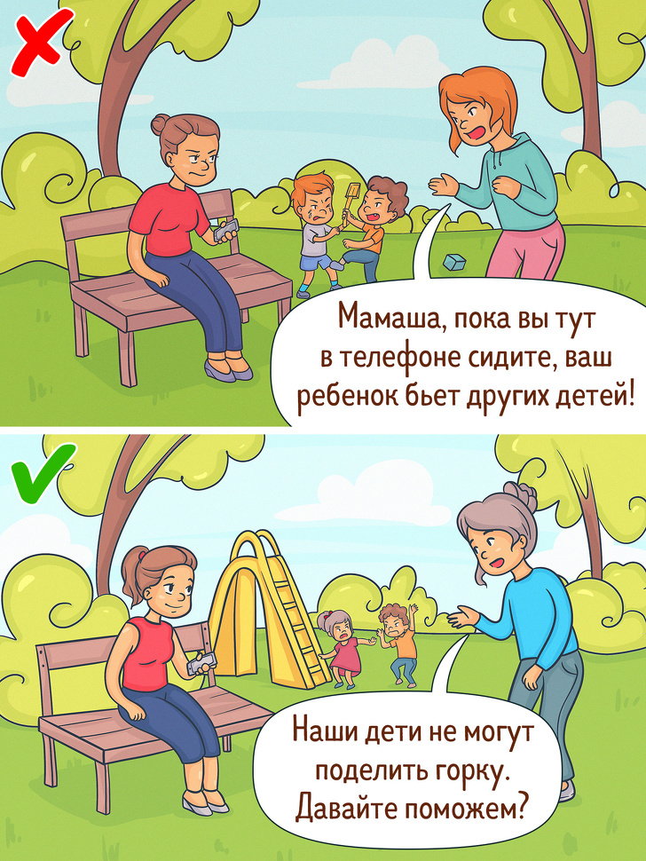 Також ви не можете вимагати в іншої дитини поступитися вам місце в транспорті або звільнити гойдалки на дитячому майданчику, тому що ваш довго чекає своєї черги. Максимум, що можна зробити, — м'яко попросити, а краще відволікти дитину якимось іншим заняттям. Так, можливо, погойдатися на гойдалках в цей раз не вдасться, але вчити дітей правилам поведінки можуть тільки їх власні батьки.