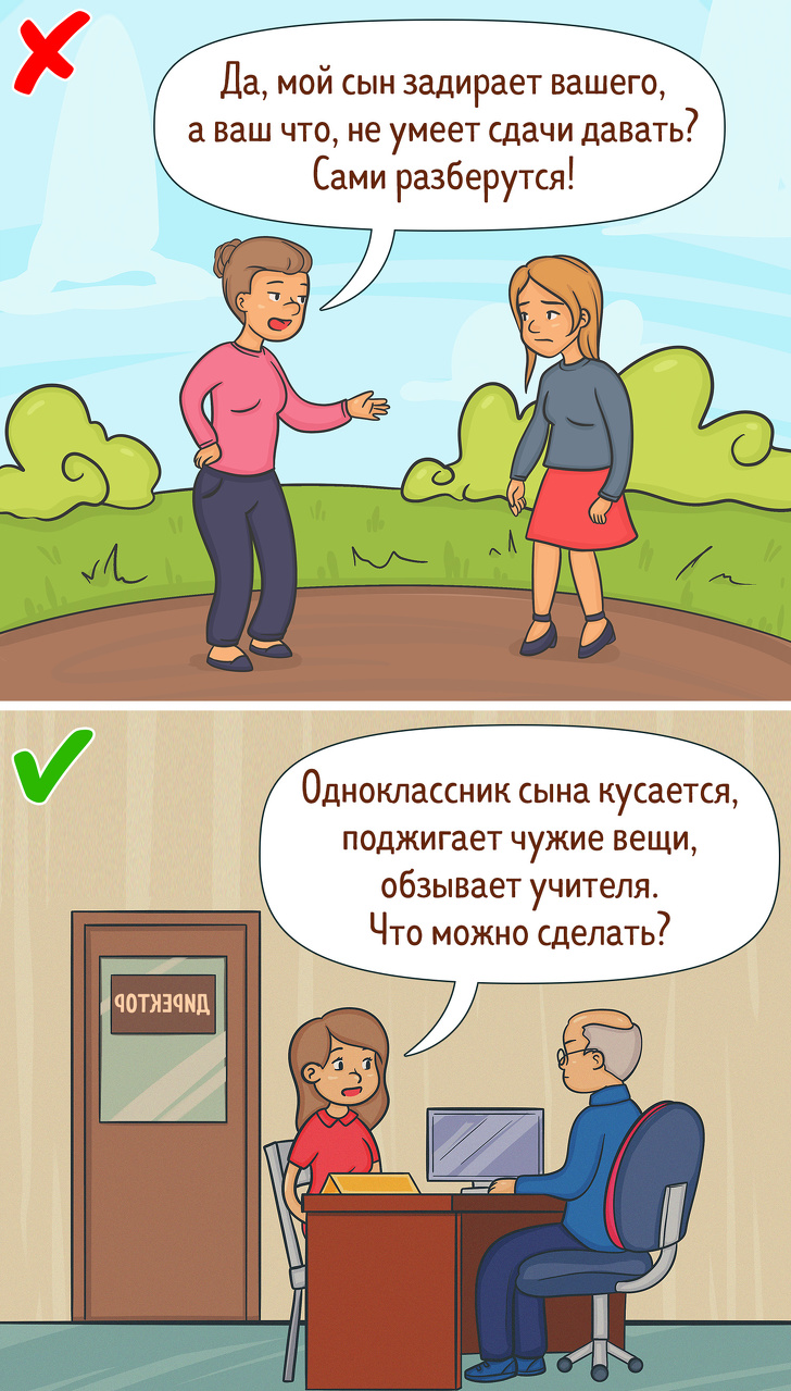 Якщо дитина порушує соціальні норми: б'є інших дітей, ламає лавку, штовхає спинку вашого крісла в кіно, плюється, кидається камінням, скидає з балкона водяні бомби і т. д., ви повинні звернутися до його батьків.