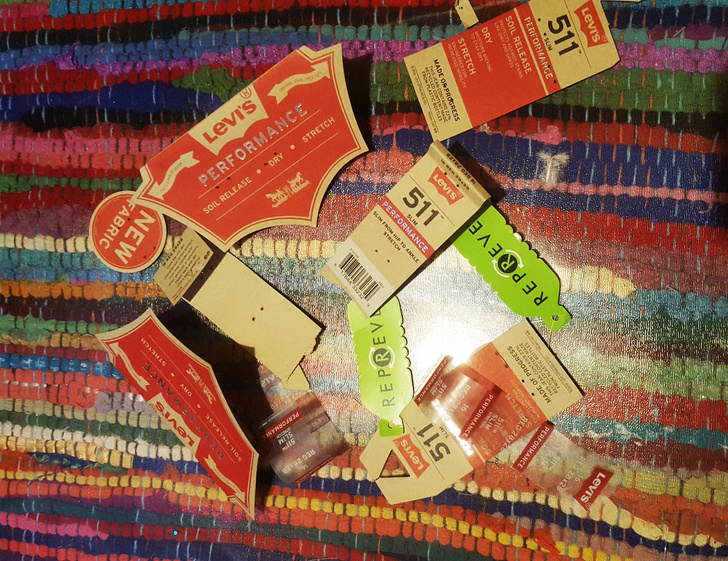 Коли на одяг чіпляють купу бирок. Зокрема, ці бирки на фото — з двох пар джинсів