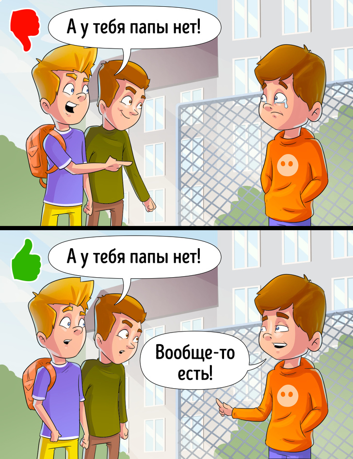 Головна думка, яку потрібно вселити: хто з батьків де живе, нікого не стосується, за винятком сім'ї. Всім кривдникам краще відповідати прямо й беземоційно: «У мене є обоє батьків». Це позбавить нападників можливості глумитися.
