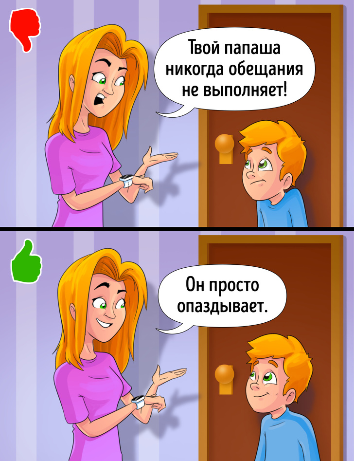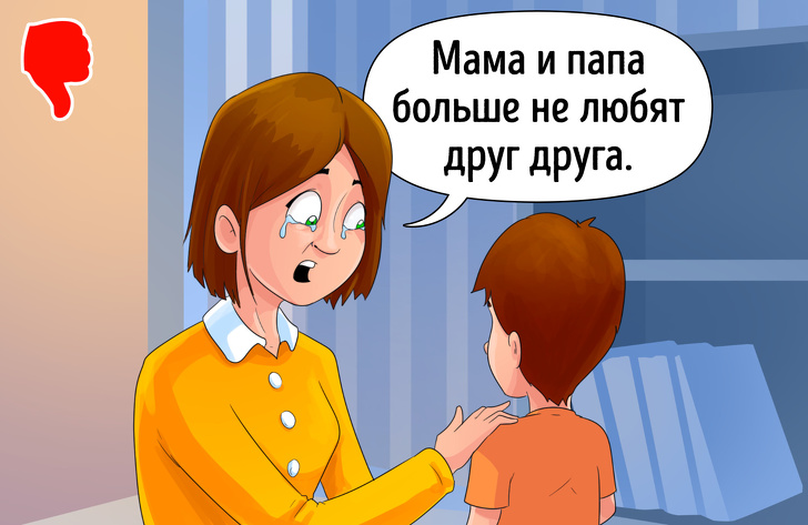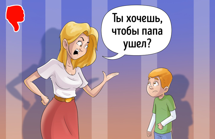 Розмови на кшталт: «Хочеш, щоб тато залишився? Скажи йому, і він залишиться» приводять дітей у отчание: скільки б вони не просили, батько все одно піде. Відповідальність при цьому формально ляже на плечі малюка, який нібито недостатньо добре просив батька залишитися. Матері психологічно стане легше.