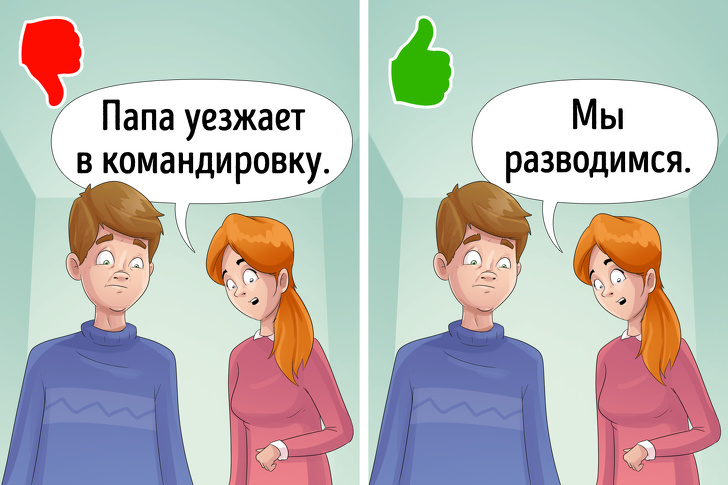 У будь-якому випадку батьки повинні знайти в собі сили пояснити дитині причину розриву, причому предметно. Головна мета такої бесіди — показати, що почуття молодших членів сім'ї зрозумілі і буде зроблено все, щоб допомогти їм подолати майбутні труднощі.