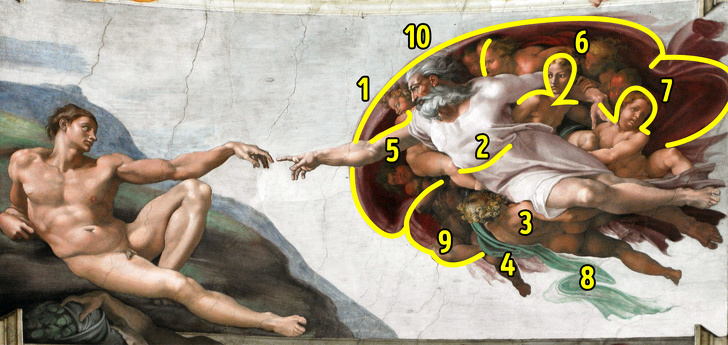 Навіть якщо ви ніколи не розглядали стеля в Сікстинській капелі, як мінімум 1 з 9 фресок вам знайома (особливо якщо ви були власником кнопкового телефону Nokia): тягнуться один до одного руки стали символом у всьому світі. Автором цього твору є Мікеланджело Буонарроті, якому вдалося не тільки створити справжній шедевр, але і зашифрувати в ньому значення, яке змінює уявлення про відомого біблійному сюжеті.