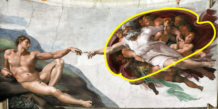 «І створив Бог людину за образом Своїм», — говорить Буття 1:27. У Мікеланджело була своя трактування цієї фрази, і, згідно популярної версії, художник на одну фреску з Адамом і Богом помістив ще третього важливого учасника у створенні розумної істоти — людський мозок. Буонарроті як би натякає, що людина здатна виглядати завершеним (як Адам на фресці), але у нього не вийде наблизитися до Творця без здатності мислити. Або, що звучить ще більш провокаційно створено людиною, а Бог — плід його фантазії (адже саме ця здатність є головною відмінністю людини від тварини). І така теорія вже йде врозріз з релігійною ідеологією.