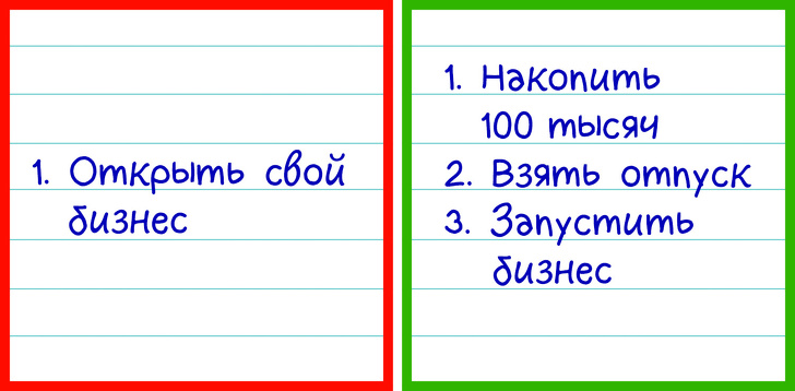 Мрія завжди масштабна, тому її краще розділити на кілька маленьких. Одна справа, коли ви хочете за рік написати роман, і зовсім інша, якщо ви вирішили писати по одній главі в місяць. По-перше, невеликих результатів простіше домогтися і вони чинять потужний мотиваційний ефект. А по-друге, дедлайни будуть коротше, що створить ілюзію швидкого досягнення мети.