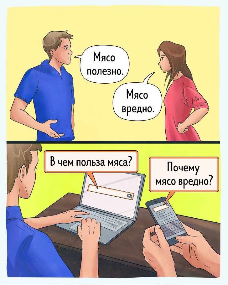 Уявіть собі, що ви з кимось сперечаєтесь, наприклад, про користь кави. Ви вважаєте, що він шкідливий. Не прийшовши в результаті спору до єдиної думки, ви звертаєтеся до інтернету, щоб перевірити там інформацію. Яким буде ваш пошуковий запит? «Чим корисний кави?» Дуже сумніваємося.