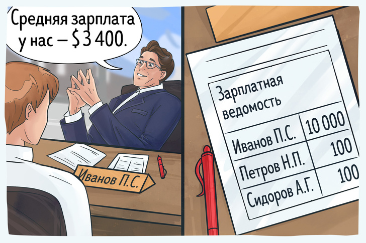Припустимо, ми хочемо дізнатися середньостатистичну зарплату в певній компанії. Глава фірми отримує 60 000, 3 — по 1 000, 1 менеджер — 3 000, дизайнер — 5 000, а також 1 бухгалтер — 10 000. Всього 7 чоловік разом з шефом. І середньоарифметичний результат, який вам, швидше за все, і піднесуть як середню зарплату, буде становити 11 570. Є ще і медіана. Це таке число вибірки, що рівно половина з елементів вибірки більше за нього, а інша половина менше. У нашому випадку медіана дорівнює 3 000 (це зарплата менеджера). І нарешті, мода, найбільш часто зустрічається величина ознаки в варіаційному ряду, буде дорівнює 1 000. Так що для шукачів та податкової фірма може уявити різну «середню» зарплату. Хоча і та, і інша при цьому будуть засновані на даних статистики.