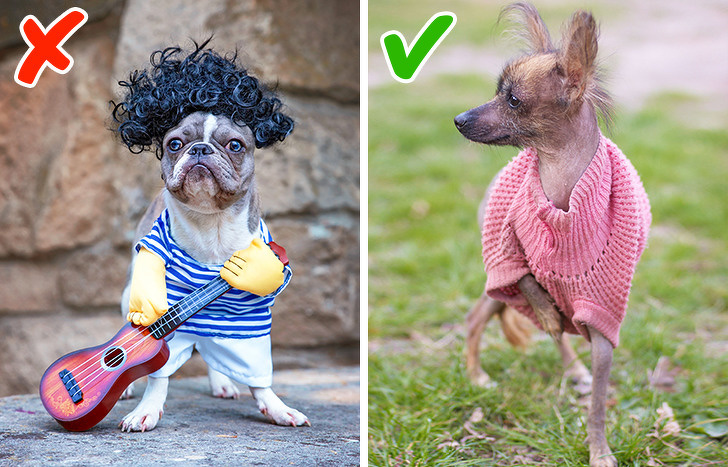 Якщо собаку не привчити носити одяг з дитинства, то в подальшому тварина буде припиняти будь-які спроби його нарядити. Допускається простий предмет одягу — светр або куртка, якщо ваш вихованець сильно мерзне під час прогулянок, але ось головні убори та маскарадні костюми тільки заподіюють дискомфорт.