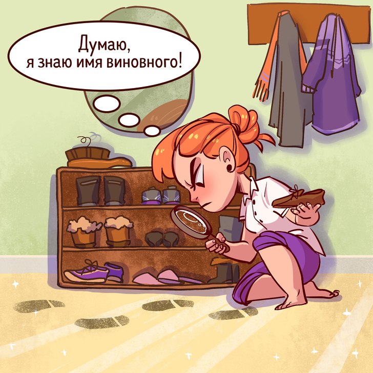 «Тільки підлогу помили! Куди ти взуття?!» — а потім скандал, що партнер не поважає вашу працю, тільки про себе й думає. Ви починаєте з'ясовувати відносини, і в підсумку ця болюча тема переростає в масштабну розбирання: ось ви вже згадуєте послідовність прибирань за останні кілька років.