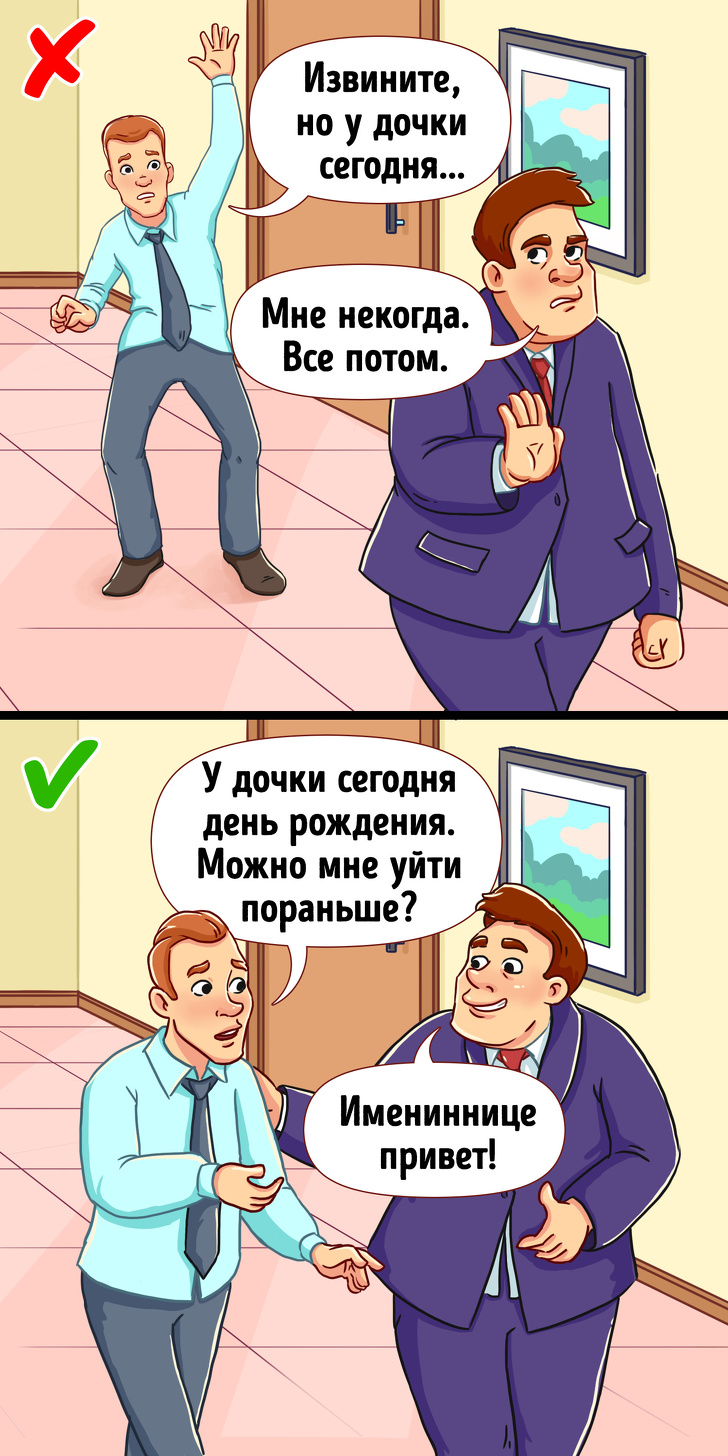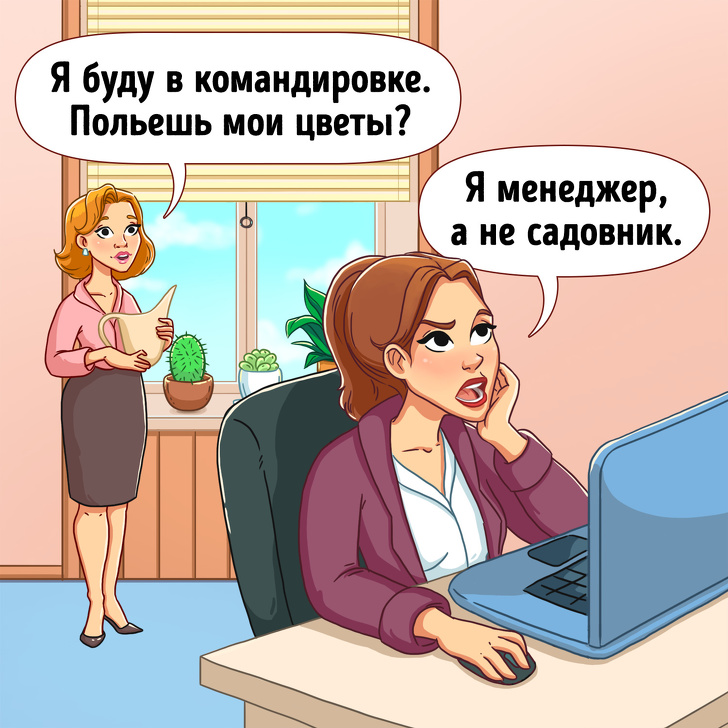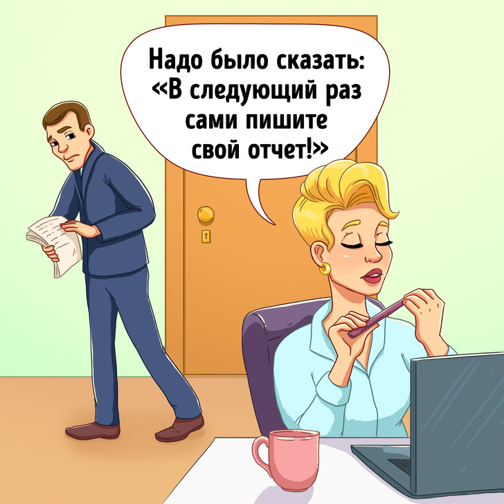 Уявіть, що на якусь ваше прохання колега відповів саме так. До таких слів хіба що можна додати: «Нічого особистого. Тільки бізнес». Такий відповідь не викличе розташування колег і начальства, швидше навпаки: в наступний раз навіть з робочою проханням до цієї людини не звернуться. Ми не говоримо, що потрібно погоджуватися на будь-які прохання і додаткові обсяги робіт. Але навіть відмова в допомозі колезі повинна бути аргументована. «Мені зараз потрібно терміново закінчити проект. Якщо встигну до п'яти, допоможу тобі». Такий підхід позначить бажання працювати в команді, але окреслить необхідність реально оцінювати свої очікування.