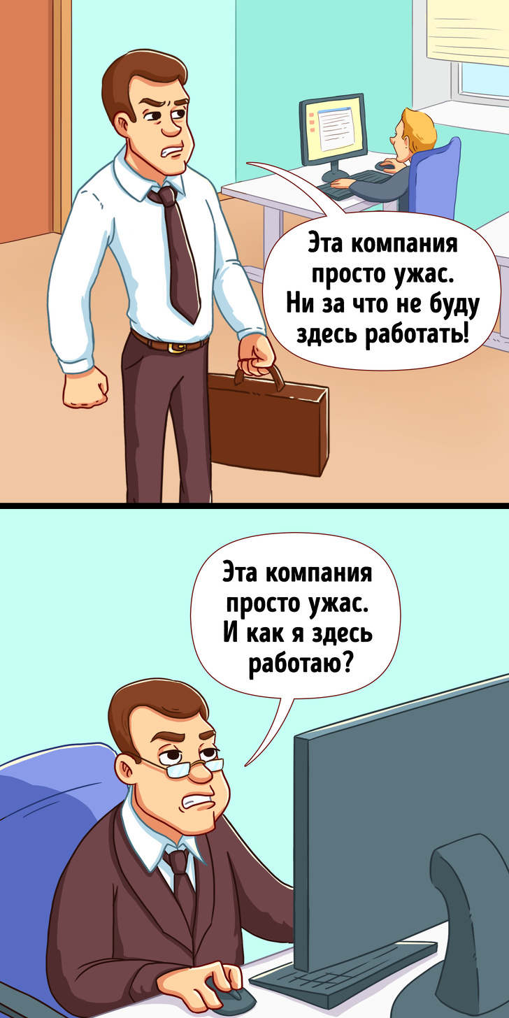 Який сенс скаржитися на компанію, в якій працюєш, і нічого не робити? А робити подібні випади в адресу місця роботи або колег — кар'єрний самогубство. Якщо в плани не входило уславитися агресивним хамом, подібні фрази взагалі треба забути. А замість цього, якщо вже правда не влаштовує щось в методах роботи організації, постаратися тактовно підняти це питання, спираючись на факти, а не на відчуття.