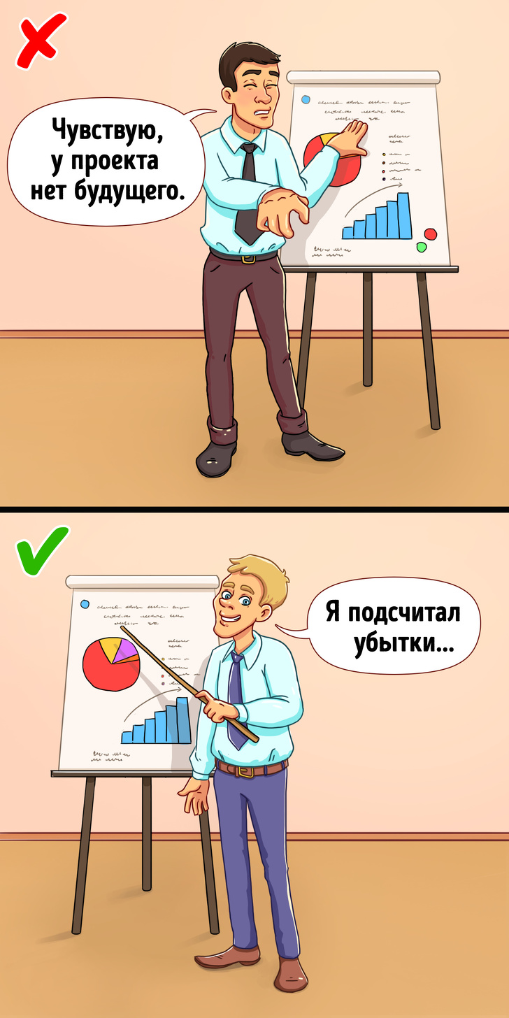 Звичайно, на роботі людина не перестає випробовувати почуття. Тут можуть бути і образа, і невпевненість, і недоречність. Інша справа, що покладатися на них (принаймні вголос) не варто. Краще підібрати кілька аргументів з області «знаю» або «думаю», ніж керуватися методом «відчуваю».