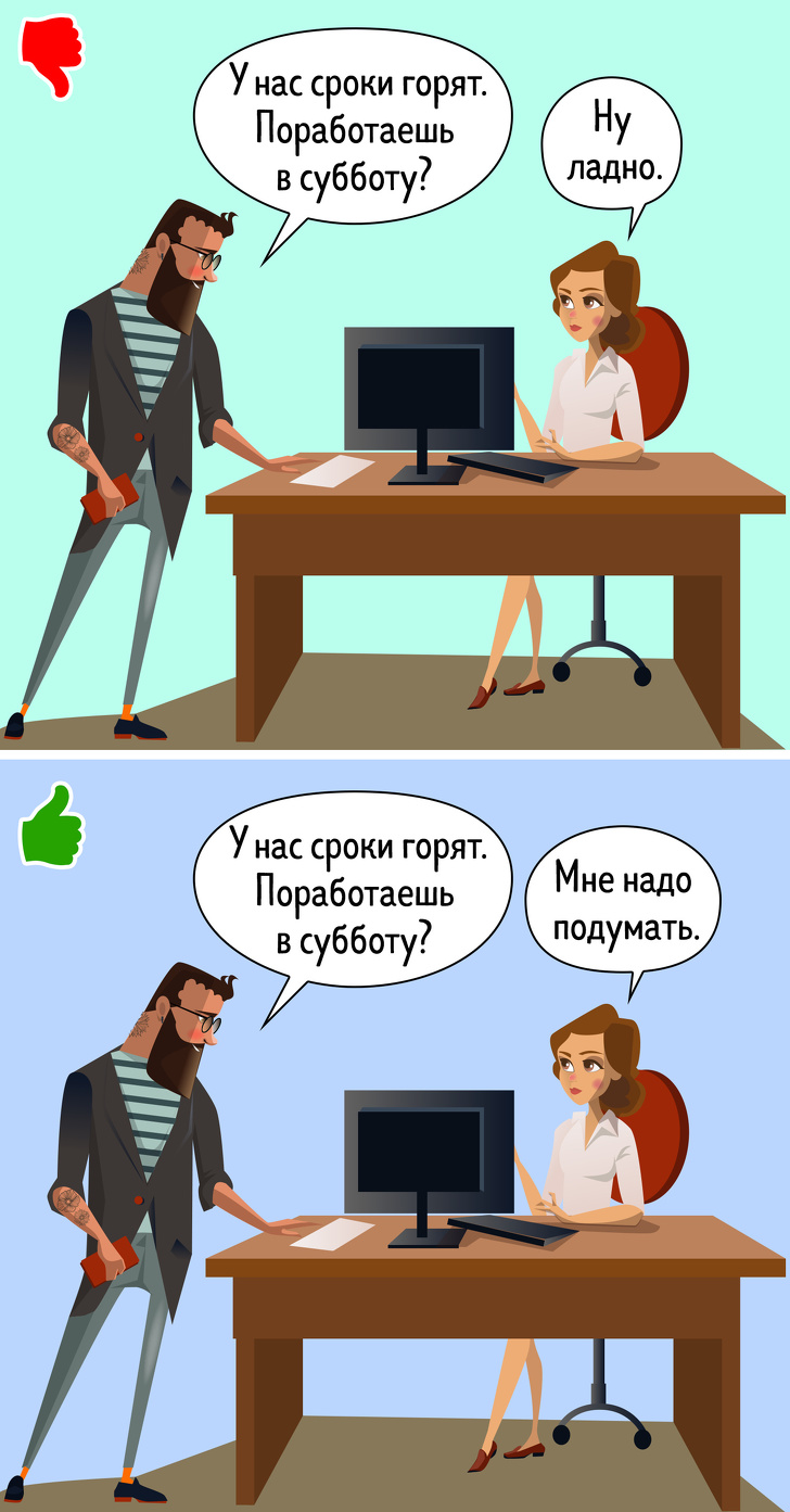 Уявіть, що вам треба дати відповідь не за себе, а за одного. Психологи впевнені, що часто ми дбаємо про близьких краще, ніж про самих себе. Подумайте, чи не обтяжує прохання одного, було б йому зручно допомогти іншій людині або виконати додаткову роботу, і тільки після цього погоджуйтеся або відмовляйте. У такій ситуації вам вдасться укласти більш вигідну для себе угоду або відмовити без зайвих докорів сумління.