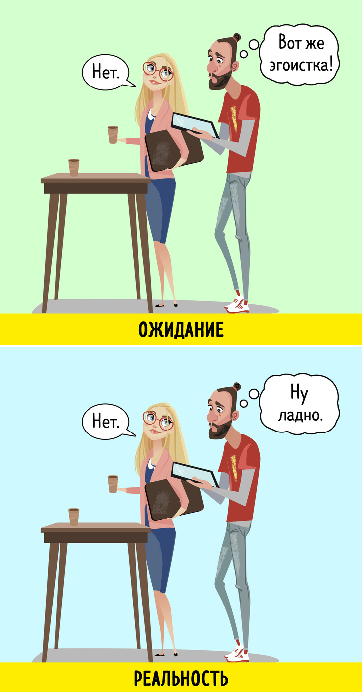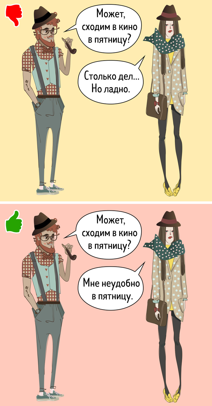 Часто прохання сприймається як тиск. Нам стає страшно чи соромно відмовити. У стресовій ситуації набагато простіше погодитися, ніж думати про те, як відмовити так, щоб не образити людину. В такий момент важливо знизити рівень стресу: спробуйте порахувати до 10 або глибоко вдихнути.