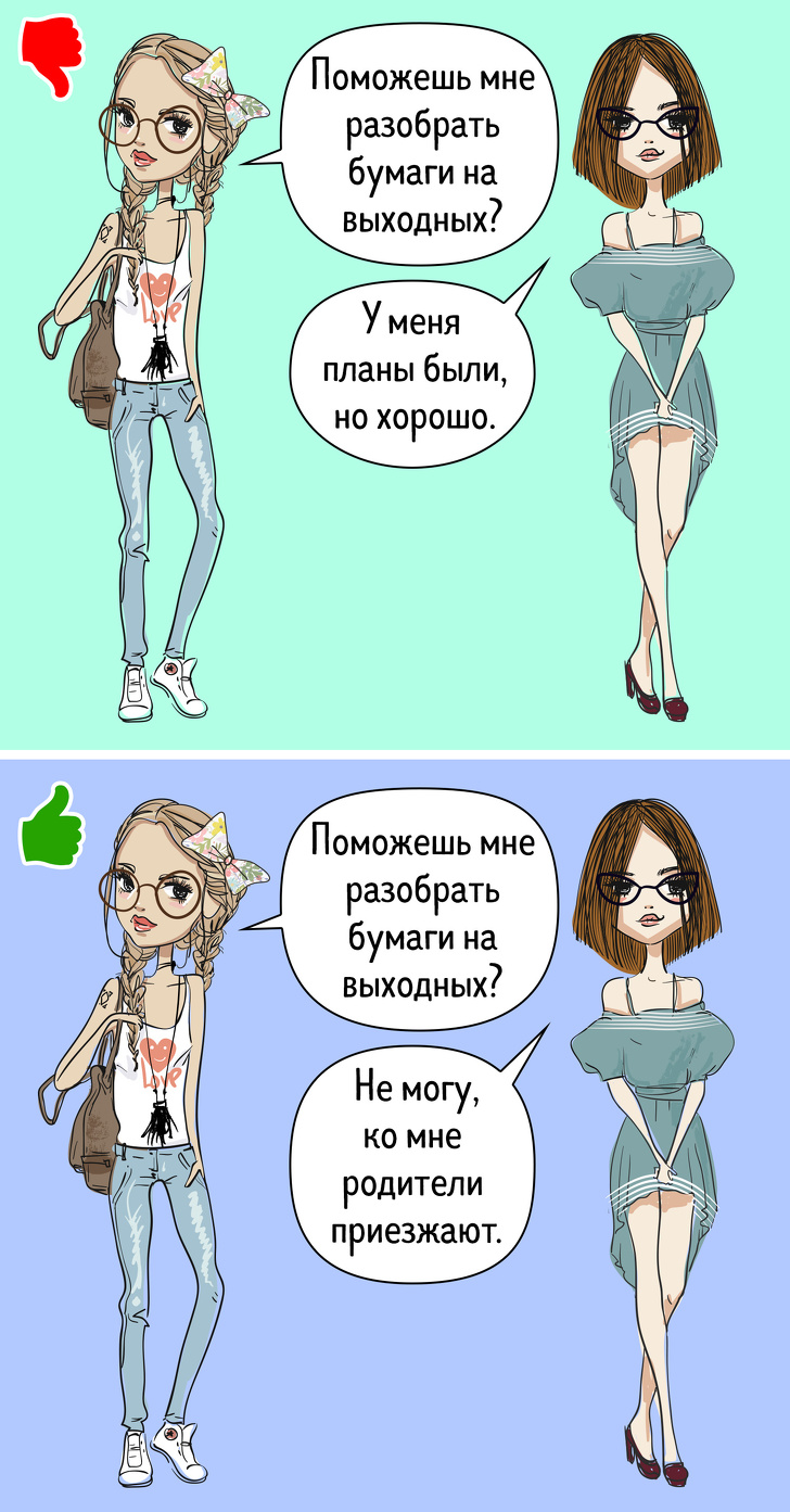 Інший варіант — прямо сказати, що вам незручно братися за справу із-за місця або часу. Це допоможе людині зрозуміти, що його прохання просто поза вашої компетенції або виконувати її дуже незручно. Якщо людина адекватна, то він зрозуміє, що обтяжує вас, і відмовиться від свого прохання. Ну а неадекватним людям простіше відмовляти.