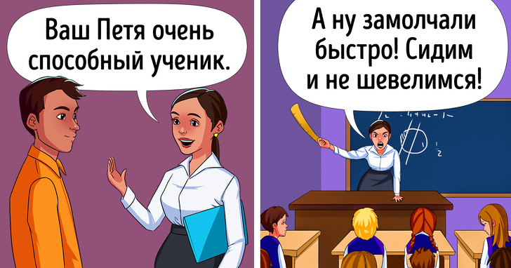 Якщо вчитель привітний з батьками, це не означає, що він так само поводиться з дітьми. З вигляду стриманий викладач на перевірку може виявитися справжнім тираном. Вчителю не можна застосовувати фізичну силу або чинити моральний тиск, наприклад змушувати учнів весь урок сидіти рівно і карати за найменший рух.