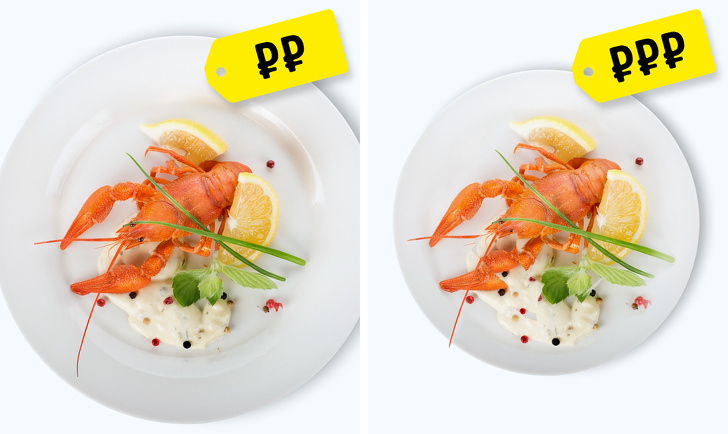 Можна помітити, що в меню рідко вказують символи валют. Дослідження, проведене в американському університеті корнелл, показало, що гості, яким надали вибір страв без знаків валют, витратили значно більше, ніж ті, хто отримав меню з зазначеними символами.