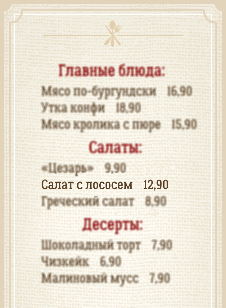 Власники ресторанів знають, що на відвідувачів добре діють трюки з назвами страв. Наприклад, як пише видання The Guardian, маркетологи довго думають над найменуванням та описом позицій у меню. Звичайне філе морського окуня навряд чи хтось зацікавить, а чилійського сібаса точно захочуть спробувати. «Торт з шоколадом» звучить банально, а «торт з бельгійським шоколадом» викликає бажання негайно його замовити.
