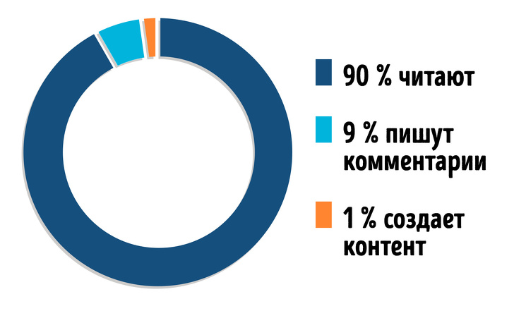 Якщо вам здається, що в інтернеті сидять одні злодії, то знайте — вам дійсно здається. Серед всіх користувачів всесвітньої павутини тільки 9 % коли-небудь залишали коментарі до статей і постів. Велика частина населення інтернету взагалі ніколи і нічого не коментує — таких користувачів 90 %, між іншим. І тільки 1 % створює контент — пише статті, знімає і викладає фото, веде блоги.