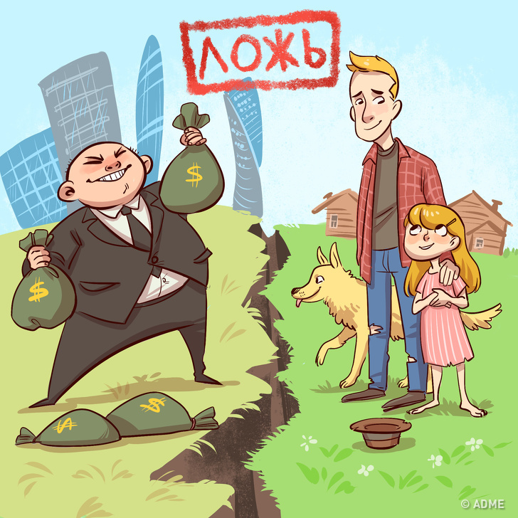 В кіно і книгах головним лиходієм часто виявляється бездушний багатій, а позитивний герой обов'язково бідний, але душа його прекрасна. Від «Пригод Буратіно» до історій про Джеймса Бонда: з малих років і протягом усього життя людина отримує помилкову установку, яка говорить, що гроші — це погано, а той, у кого їх багато, обов'язково дурний, підступний і духовно неповноцінна. Часто до цієї установці додається ще одна: багатий — значить вкрав. Ніхто не хоче, щоб про нього так думали, і з цих міркувань деяким зручніше залишатися бідними і говорити «зате ми люди чесні».