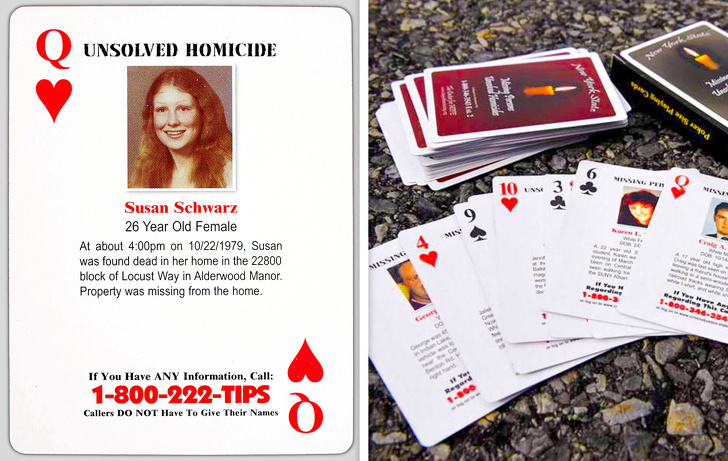 Ще один приклад, який доводить, що ніколи й ні перед ким не варто хвалитися досягненнями в області злочинів. Сьюзан Шварц була застрелена в своєму будинку, але поліція не виявила жодної зачіпки, тому справа залишилася нерозкритою. Але фотографія дівчини потрапила в тюремний експеримент: уряд друкувало для ув'язнених колоди карт, на яких була вказана інформація про жертви нерозкритих злочинів, номер телефону та обіцянка нагороди.