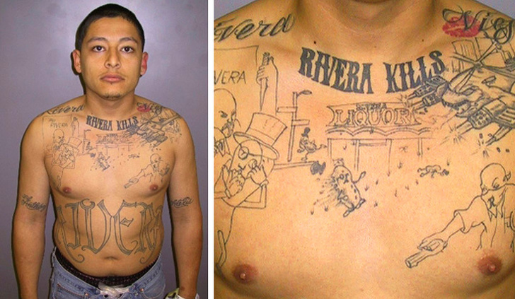 І тільки пізніше, коли один з поліцейських, знайомий із справою про пограбування винного магазину, переглядав стопку фотографій з ділянки, він з подивом виявив на одному зі знімків татуювання, яка з точністю описувала сцену злочину. Там навіть була вивіска магазину і підпис про те, що скоєно вбивство.