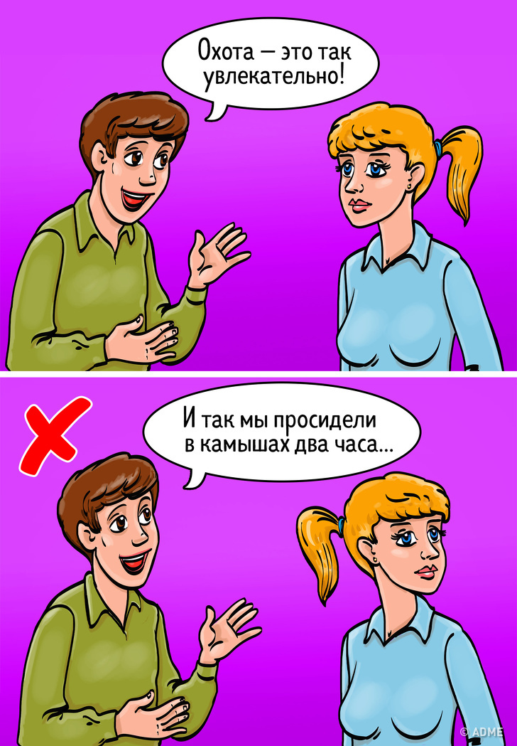Не зациклюйтеся на своїх унікальних захоплення, якщо співрозмовник не поділяє їх або не проявляє інтерес. Якщо вас запитали про ваше хобі, це ще не означає, що ваші заняття по четвергах в клубі прикладної механіки дійсно комусь цікаві. Це може виявитися просто жестом ввічливості. Знову ж таки, щоб при першій зустрічі розташувати співрозмовника, набагато важливіше проявляти інтерес до того, що вам говорять, ніж розповідати про себе.