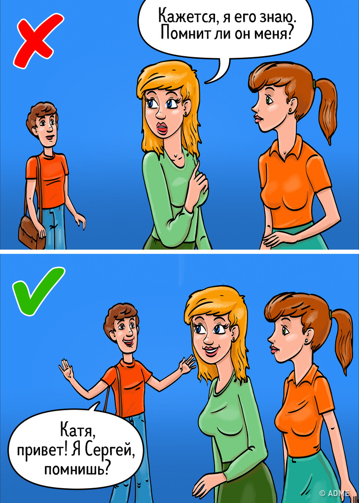 Якщо ви бачите людину, з якою зустрічалися раніше, нехай навіть мигцем, буде ввічливим представитися ще раз нагадати, де ви бачилися. Таким чином ви уникнете незручності, коли людина, яку ви знаєте, буде згадувати вас або мучитися сумнівами, чи пам'ятаєте ви його. Почати можна, наприклад, так: «Привіт! Не знаю, чи пам'ятаєте ви мене чи ні, я — Світла, ми бачилися на презентації... Як ся маєте?» Людям сподобається, що їх згадали, а ви як мінімум одного співрозмовника вже знайдете.