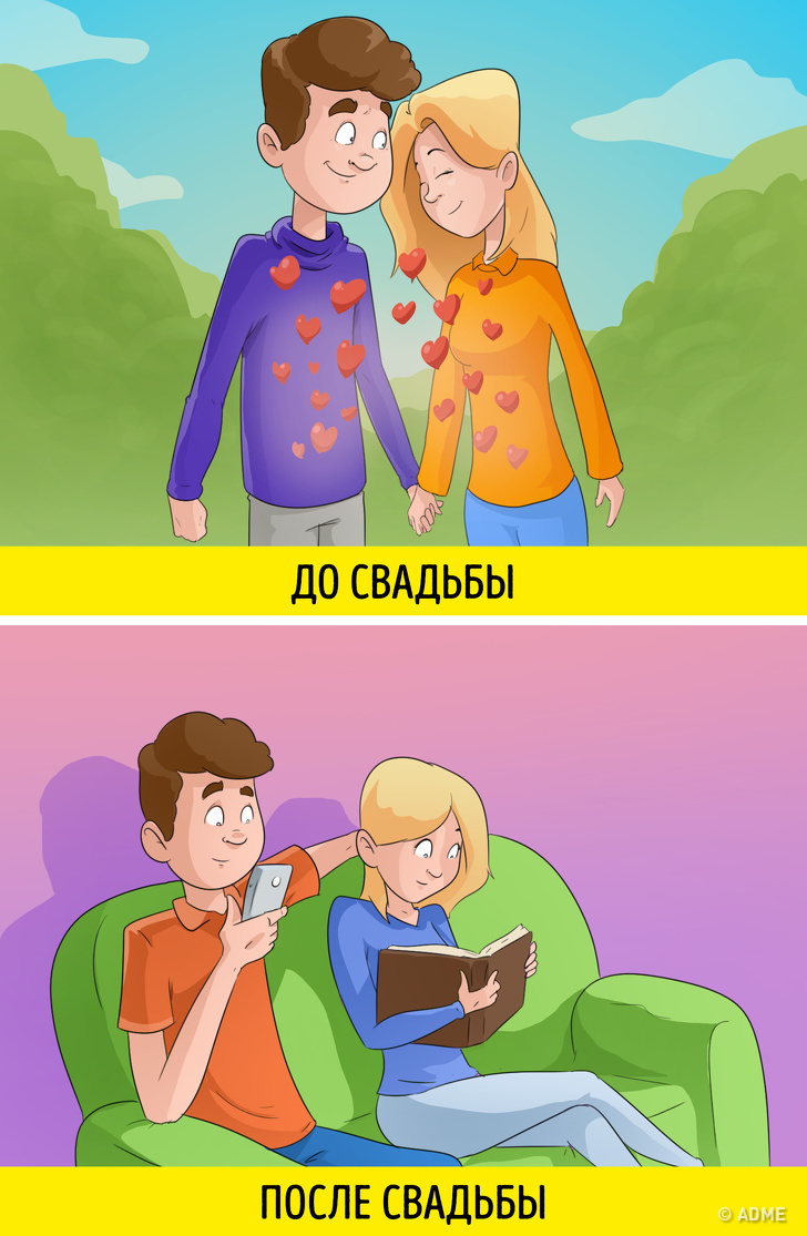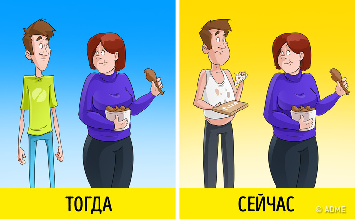 Люди, які живуть разом, набирають в середньому по 2,5 кг тільки за перший рік шлюбу. Звичайно, такий набір ваги не призведе до ожиріння у тому випадку, якщо шлюб не містить розбіжностей і скандалів.