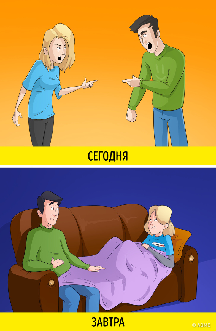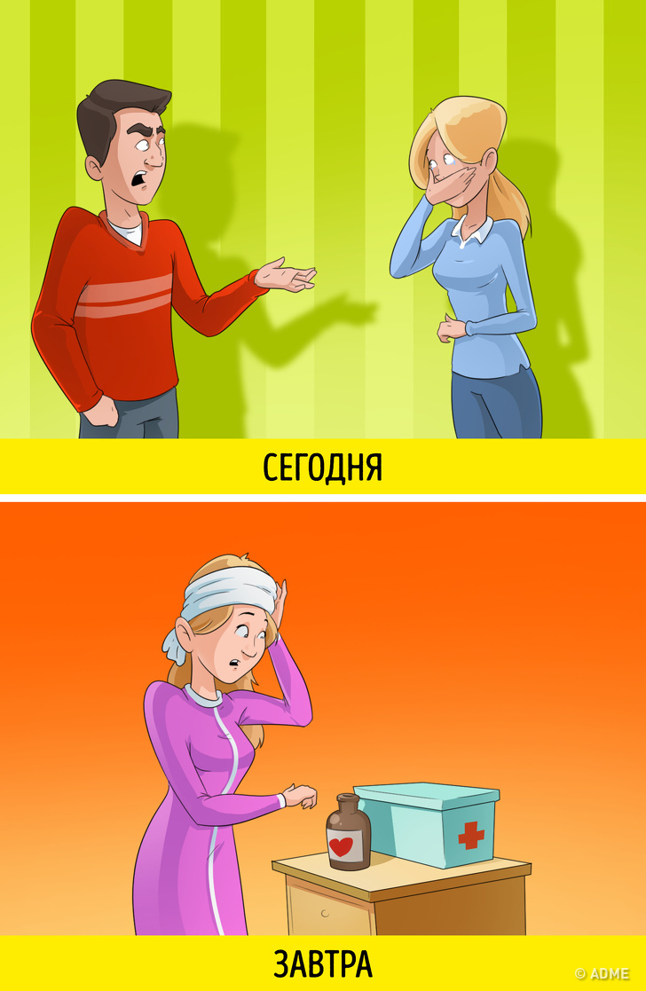 Порада: не чекайте, поки погані стосунки в шлюбі приведуть вас до психотерапевта. Намагайтеся усувати протиріччя відразу після їх виникнення. Не допускайте ситуацій, коли сварки затягуються і починають завдавати відчутної шкоди здоров'ю.
