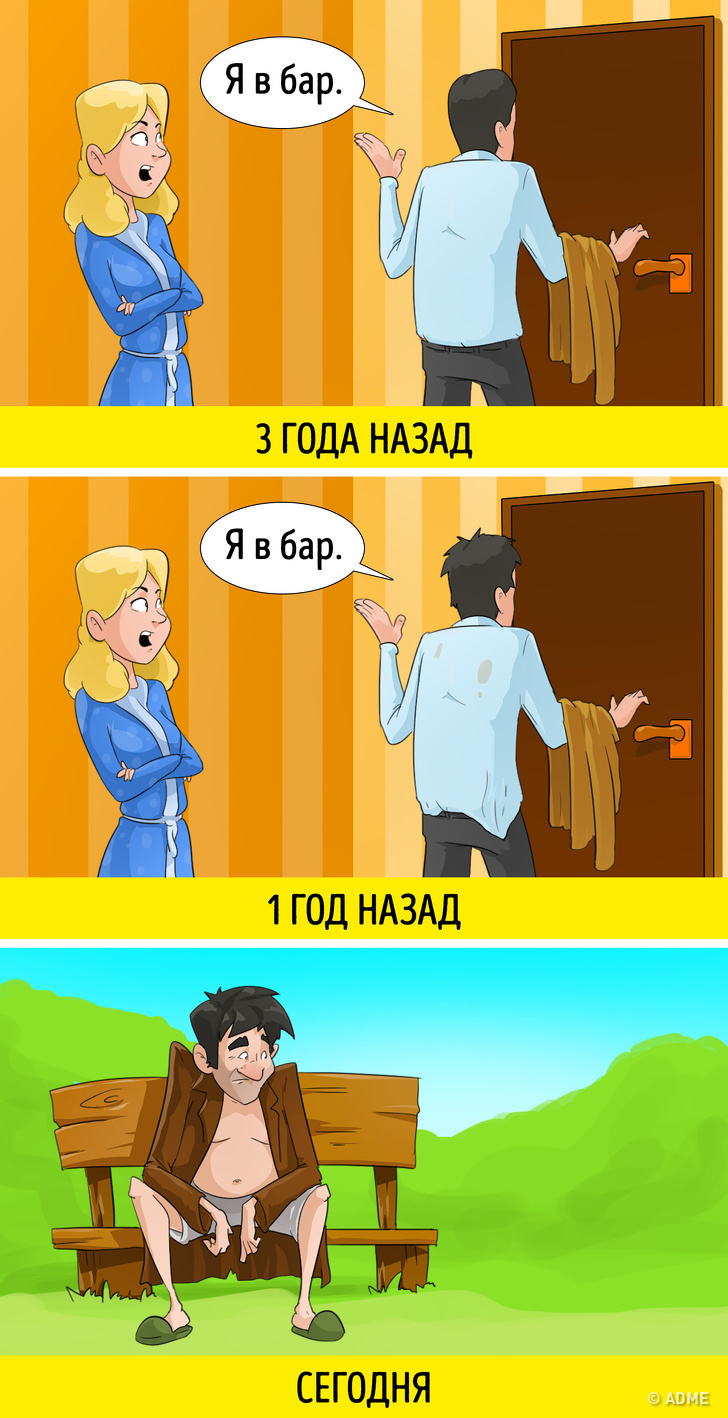 Невдалий шлюб дійсно може провокувати тягу до алкоголю і тютюну. Довге знаходження в стресі часом штовхає людей до нездоровим залежностях, в тому числі і до залежності від шкідливої їжі. Часто поганий приклад виявляється заразливим, і тоді чоловік поділяє шкідливі захоплення другої половини.