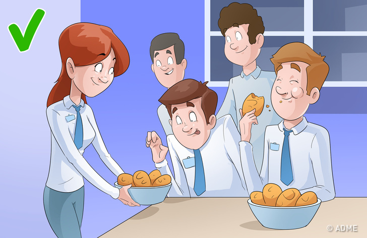 Не обов'язково весь день стояти біля плити (хоча це, звичайно, - вищий пілотаж), достатньо принести до чаю печиво і пригостити ними всіх. А якщо це стане традицією для всього колективу, то голодним ви на роботі точно не залишитеся.