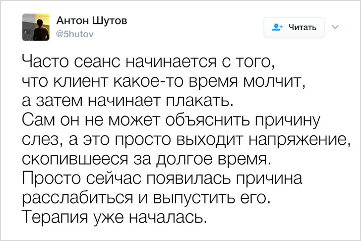 - У деяких психологів є дуже дивні методи роботи з клієнтами. Наприклад, я знав одного психолога, який працював терапією мовчання. Він зустрічав клієнта, і вони просто сиділи і мовчали протягом години. Далі клієнт платив гроші і йшов.