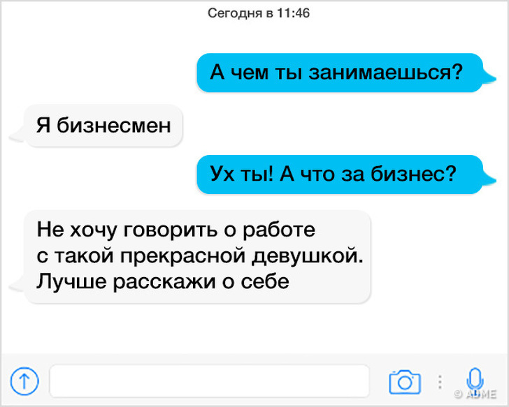 - Говорить про роботу розпливчасто. У більшості дорослих людей робота займає більшу частину часу, і замовчування такої важливої частини життя може говорити про те, що людині є що приховувати. Загальні фрази, наприклад: «у мене свій бізнес», «я підприємець», «працюю на себе» і т. д. дуже часто використовують безробітні.