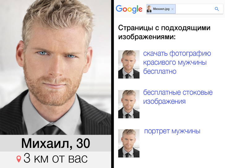 Нерідко трапляється, що користувачі виставляють фотографії інших людей замість своїх, дізнатися про це можна, завантаживши скрін фотографії вашого нового знайомого в пошук по картинках. Браузер видасть вам всі соцмережі та сайти, де зустрічалося це зображення.