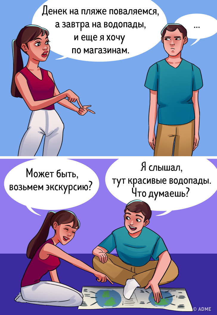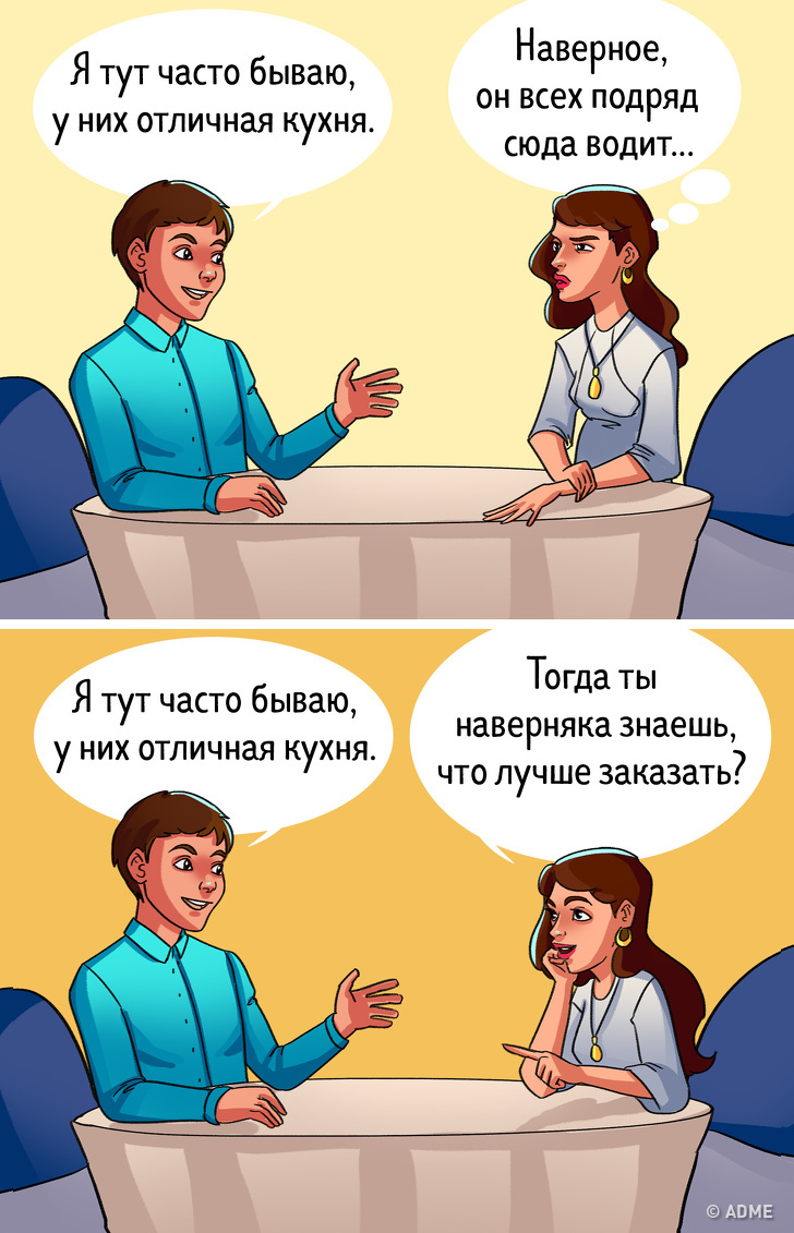 Ми не зможемо перекроїти свою свідомість і мислити так, як цього б хотілося протилежної статі. Але ось пощадити їх мозок і не атакувати формальну логіку фразами на кшталт: «Я відчуваю, що щось не так!» ми точно в силах. Хоча б на перших етапах відносин.
