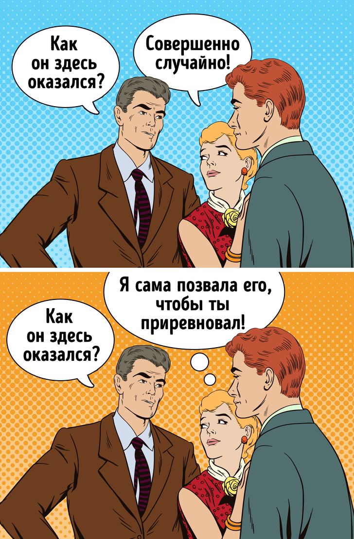 Нерідко дівчина як би ненароком розповідає супутнику про те, які знаки уваги їй надають інші чоловіки. Іноді вона і зовсім може спровокувати виникнення конфліктної ситуації, наприклад, з колишнім або менш щасливим залицяльником.