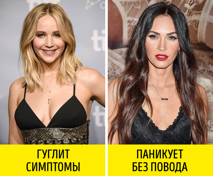 До речі, голлівудська діва Дженніфер Лоуренс в інтерв'ю зізналася в тому, що вона іпохондрик і часто гуглить симптоми. А Меган Фокс стверджує, що у неї купа фобій і одержимостей, так що іпохондрія порівняно з усім цим просто дрібниці.