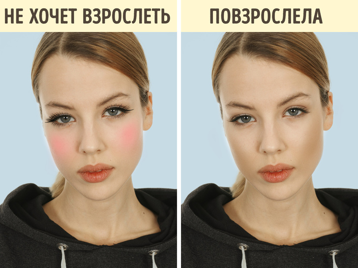 Деякі дівчата не бажають дорослішати і висловлюють свій протест через макіяж. Велика кількість рожевих рум'ян, яскравий підлітковий макіяж з акцентом на очі і особливо візуальне збільшення очей видають дівчину, яка все ще хоче залишатися дитиною. Такі дівчата насправді сприймаються молодше і частіше за інших схильні до інфантильності.