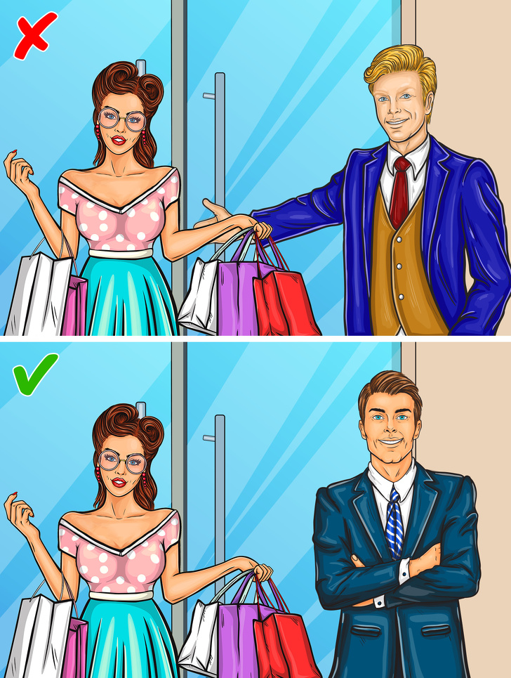 Справжній джентльмен завжди пропустить даму вперед. Але в офісі це правило не працює. Дотримуючись сучасного етикету, рекомендується входити і виходити першим того, хто знаходиться ближче до виходу. Жінки не тільки відкривають самі двері, але і при необхідності пропускають інших, незалежно від того, чоловік це чи жінка. Ті ж правила стосуються і входу в ліфт. Також в офісі і чоловік, і жінка надягають кожен своє пальто сам, однак, якщо у жінки виникло з цим утруднення, чоловік може допомогти.