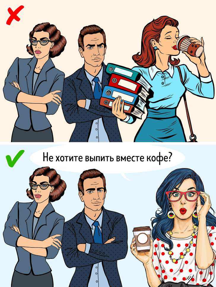 Пити каву в поодинці в присутності колег вважається поганим тоном. Буде краще запропонувати напій колегам. Пауза серед робочого процесу буде відмінною можливістю перепочити, це знизить напругу в колективі. Продумайте заздалегідь кілька спільних тем для розмови, але ніколи не обговорюйте особисте життя.