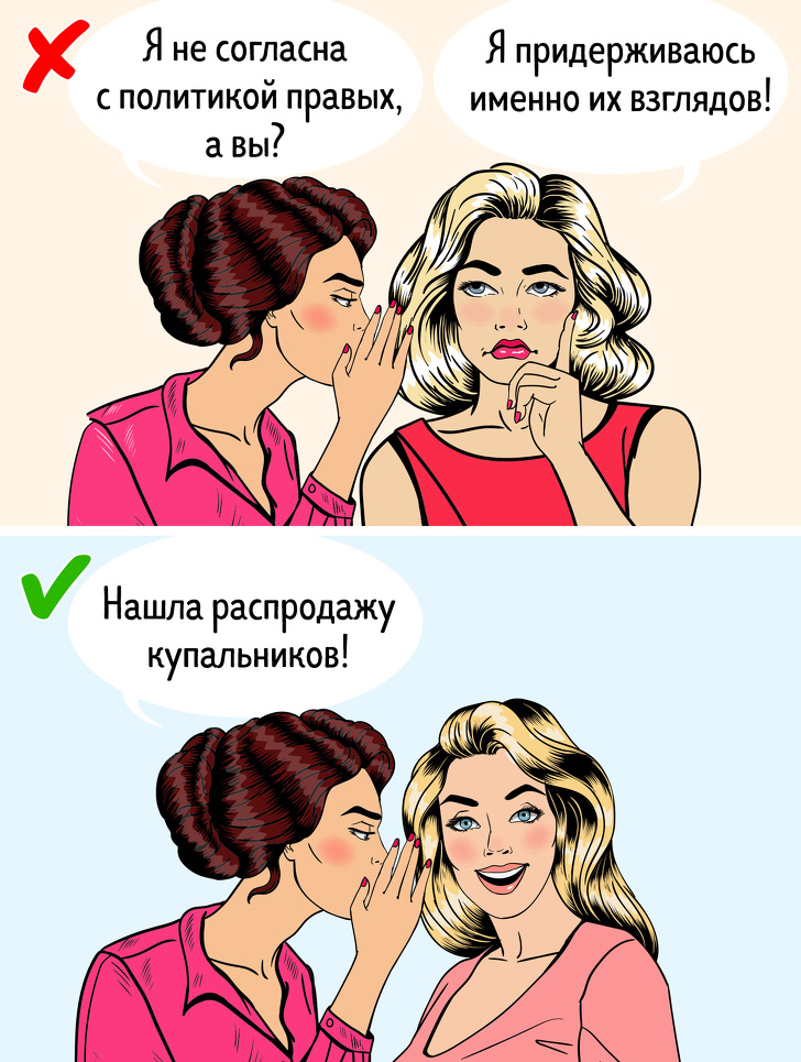 У розмовах в офісному просторі не зачіпайте політику і релігію, існує великий ризик того, що відносини будуть зіпсовані, краще дотримуватися загальних і нешкідливих тем для дискусії. Уникати збору грошей на подарунки колегам до свят, спільних чаювань і зустрічей на громадських заходах після роботи не слід без вагомої причини. Від небажання брати участь у житті офісу можуть виникнути особисті неприязні і напружені відносини з товаришами по службі.