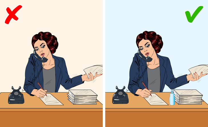 Утримувати робоче місце в чистоті, особливо в офісі відкритого типу, — значить проявляти повагу не тільки до себе, але і до колег. Однак ще однією доброю звичкою вважається дезінфікуючий засіб для рук, яке завжди стоїть на столі. Потрібно як можна частіше протирати руки, клавіатуру, мишку, телефонну трубку, щоб запобігти поширенню мікробів.