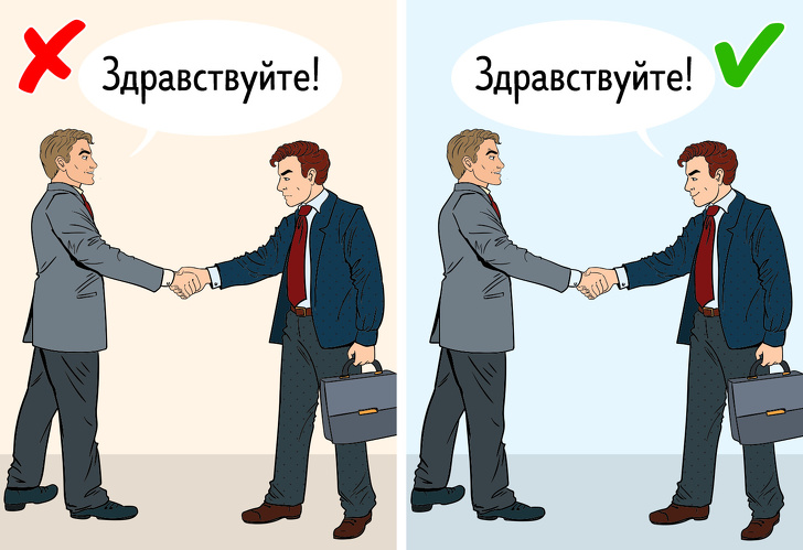 Першим вітається підлеглий, вже після цього — начальник. Виняток становить ситуація, коли начальник входить в кімнату, де вже сидить кілька співробітників. В даному випадку шефові слід першим вимовити слова привітання.