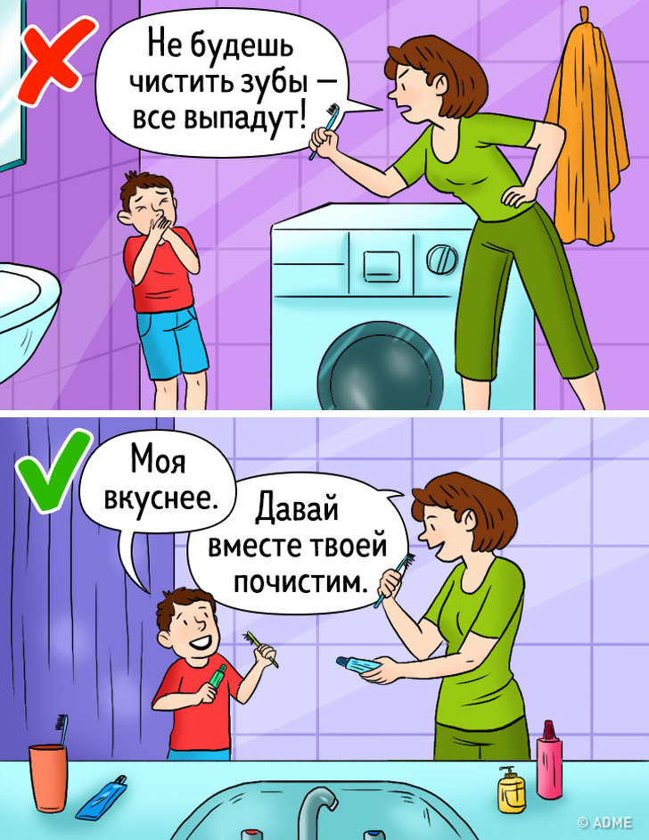 Дуже важливо не акцентувати увагу на поганому запаху («Не дитина, а порося!») чи брудних зубах («Не будеш чистити — згниють!»), а змістити фокус в бік задоволення від водних процедур. Смачна зубна паста, мультяшна щітка, яскраві м'які рушники, шампунь із запахом шоколаду, веселі купальні традиції — подібні речі зроблять так, що дитина сама буде радісно бігти у ванну кімнату.