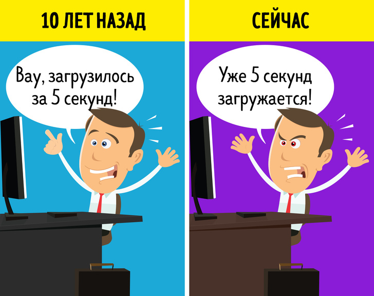 Недавнє дослідження виявило, що 77 % американських службовців не беруть відпустку, тому що бояться, що це зашкодить їхній кар'єрі. З японської мови прийшло поняття "кароса" – смерть від надмірної роботи без перерв. А агресивна поведінка і дратівливість під час стояння в черзі знайомі всім. Дійшло до того, що користувачі інтернету зазвичай не дивляться відео, якщо воно завантажується довше 2 секунд, хоча ще кілька років тому ми чекали завантаження сайтів куди довше.