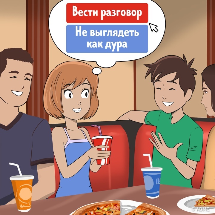 У громадських місцях м'язи і кінцівки ніби виходять з-під контролю. Здається, що рухи стали незграбними і навколишні ось-ось отримають привід для сміху. Звичайні дії перетворюються на тортури. Наприклад, прийом їжі в кафе. Не вдається зосередитися на своїх думках або бесіді, відправляючи в рот шматочки піци «на автопілоті». Мозок метається між декількома режимами: «Граціозно жувати», «Контролювати міміку», «Не втрачати нитку розмови».